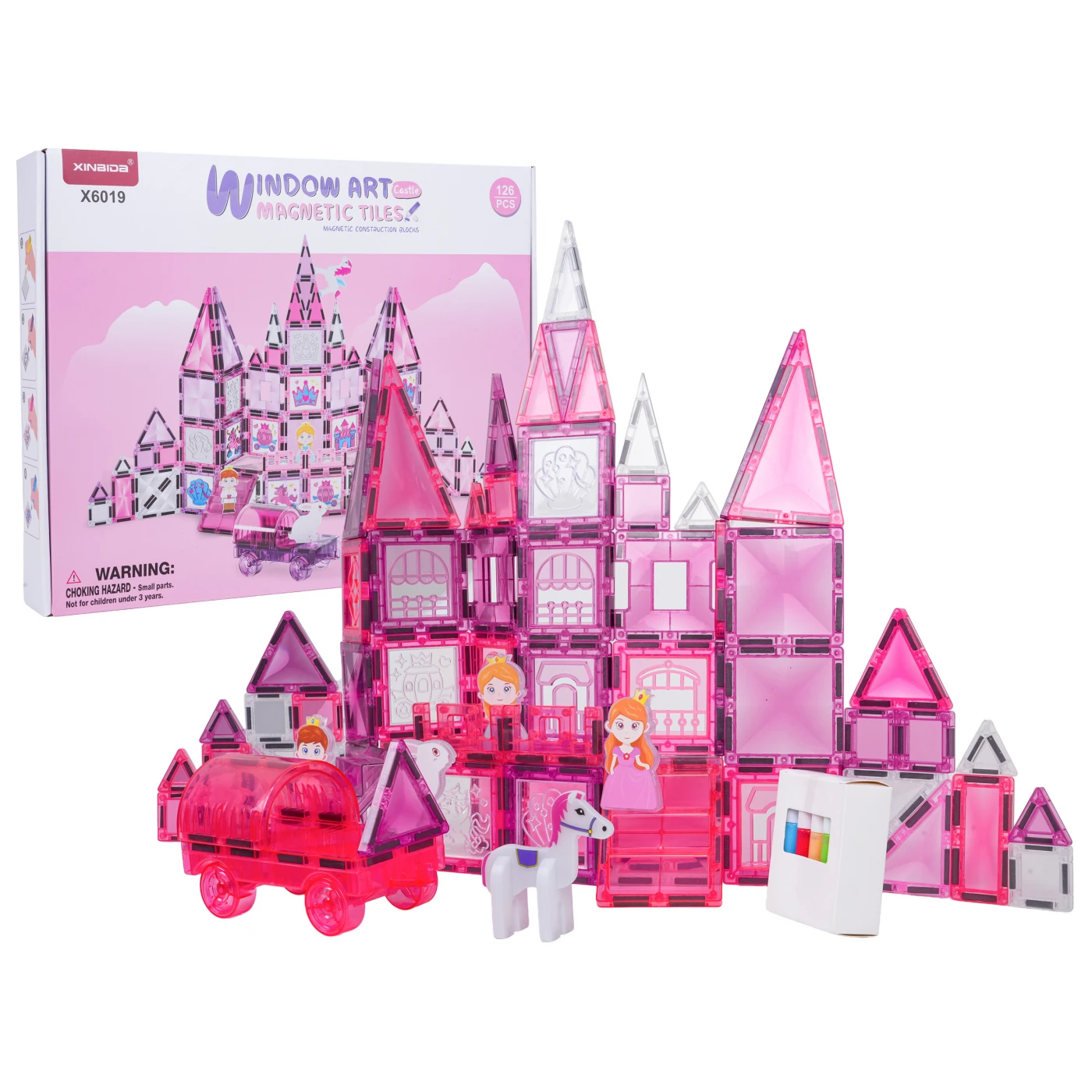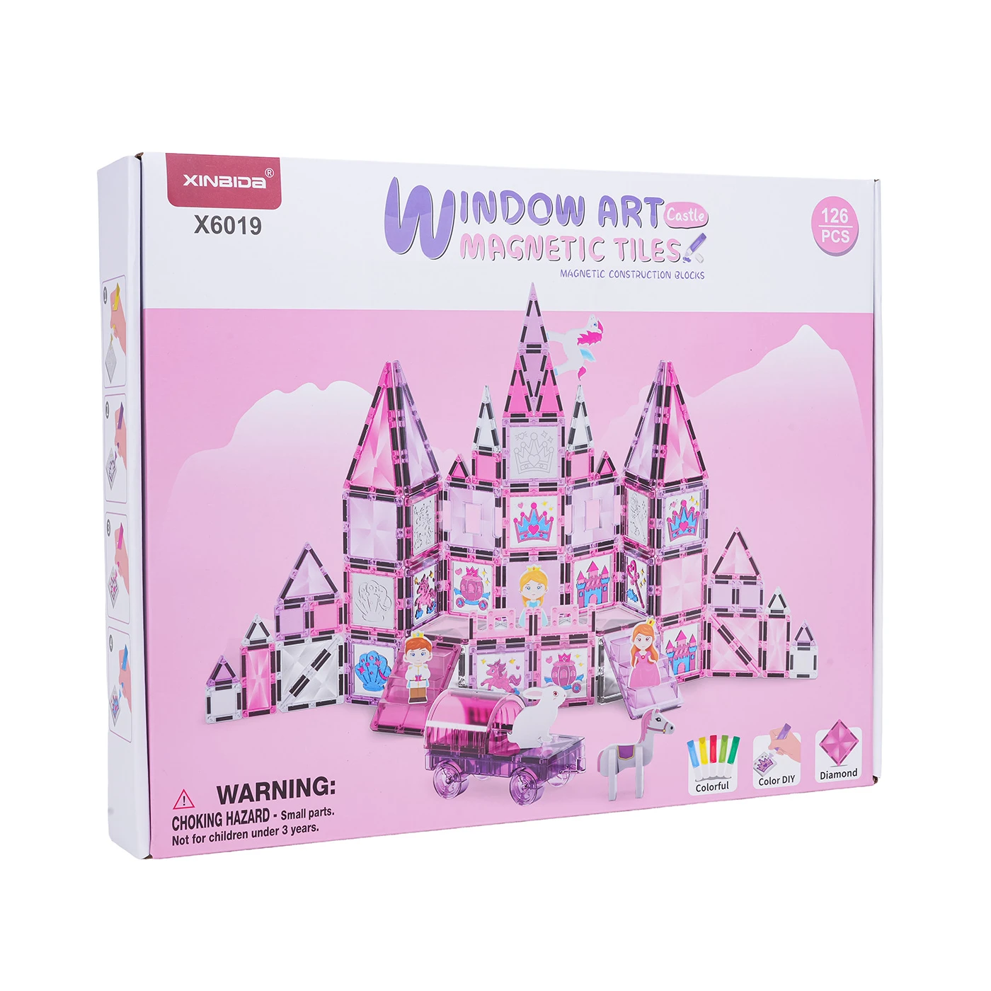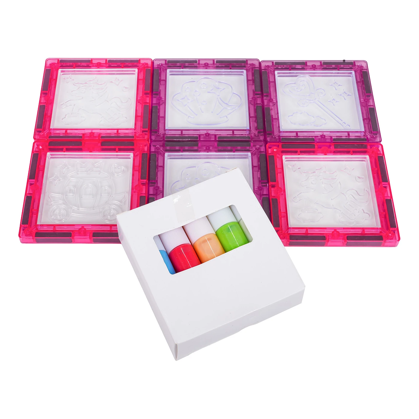 Värvitavate elementidega magnetklotside komplekt koosneb 126-osast – näiteks magnetklotsid, printsessi- ja hobuse figuurid, ratastega vanker ning magnetilised värvitavad elemendid ja markerid.