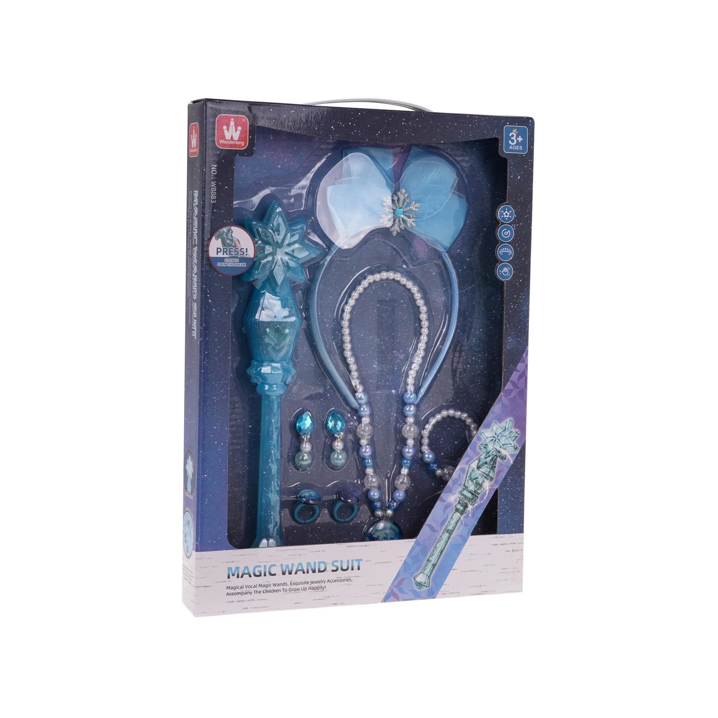 Komplekt sisaldab juuksepaela, heli- ja valgusefektidega võlukeppi ja ehteid.