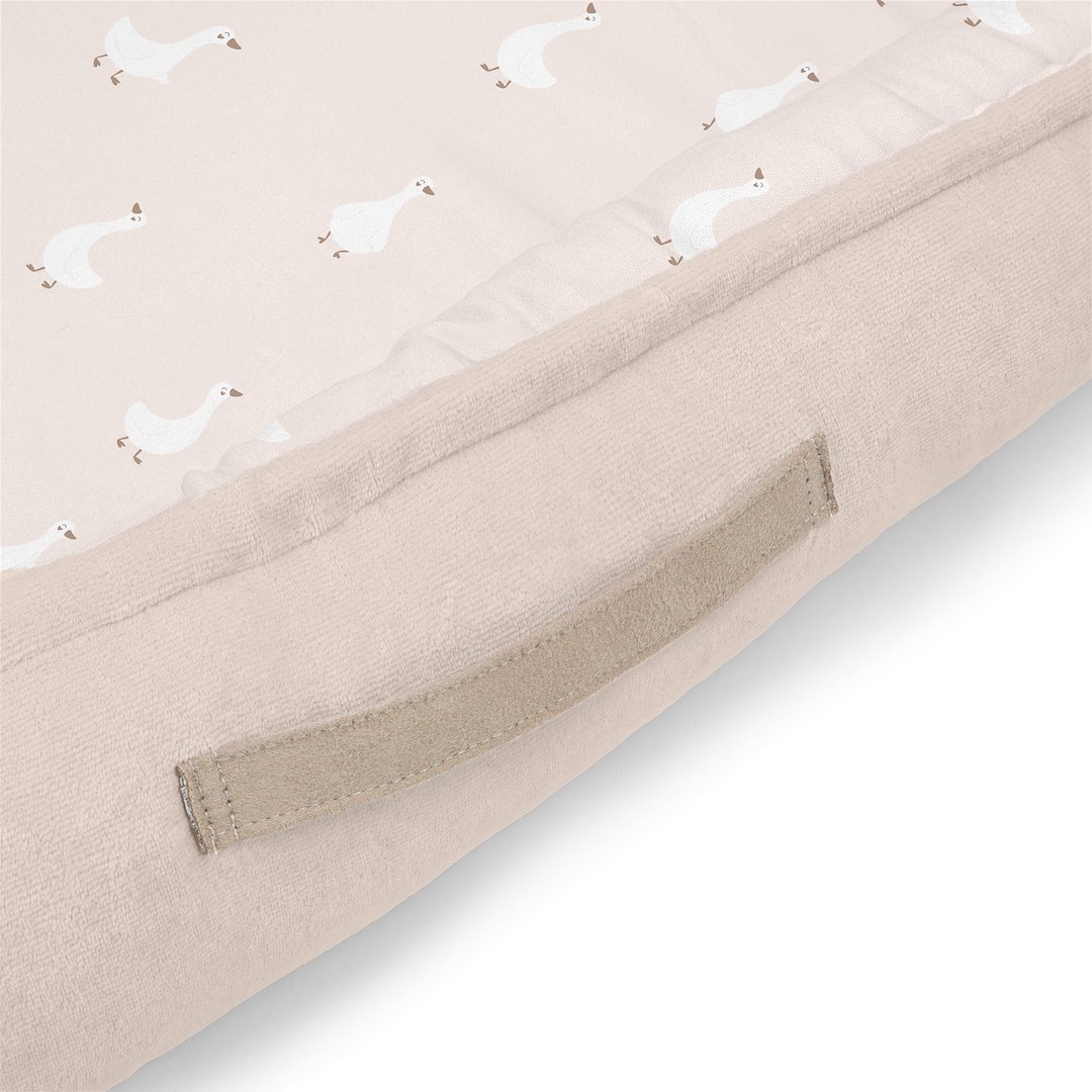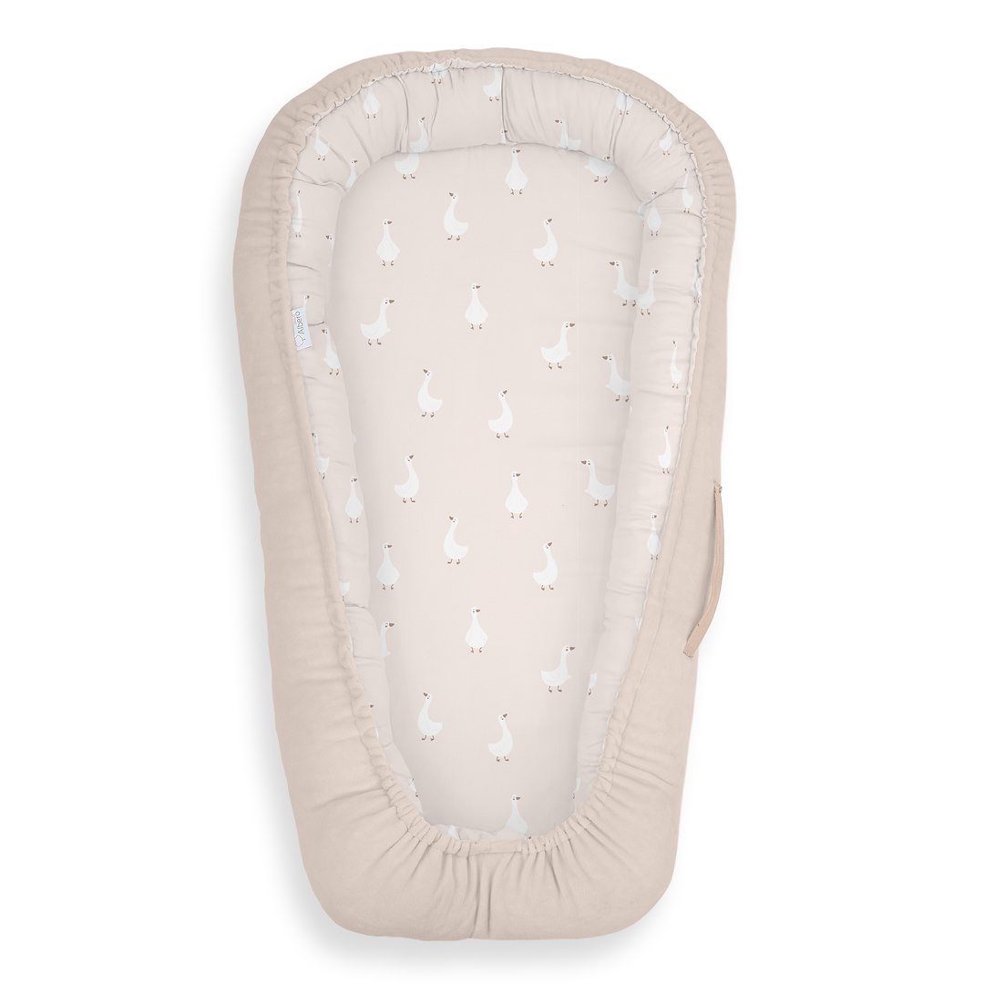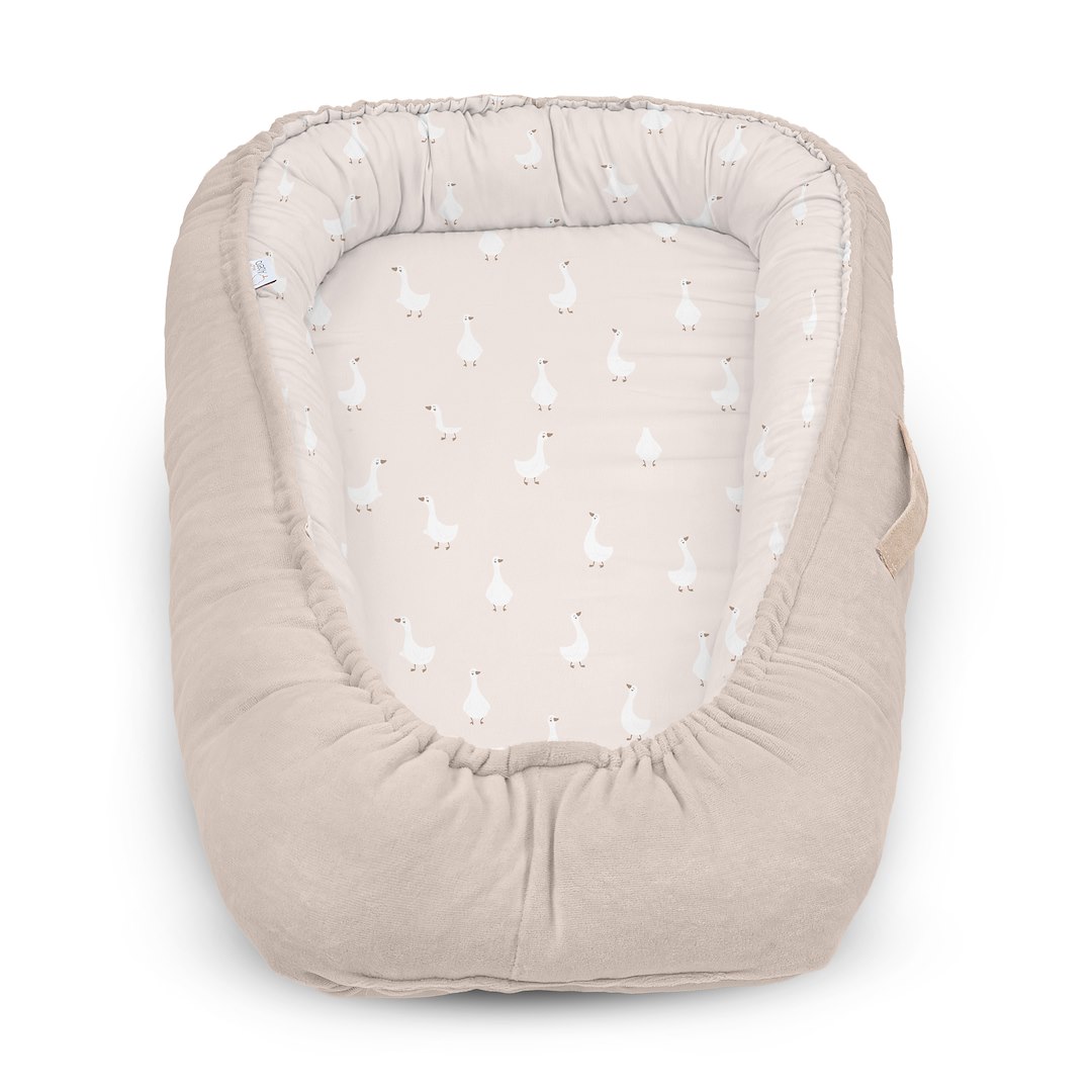 Õrn seespool olev satiinkangas ümbritseb last ja pehme veluur välisküljel lisab hubasust. Kookoni täidis on hüpoallergeenne, mis minimeerib allergiate ja beebi nahaärrituste riski.