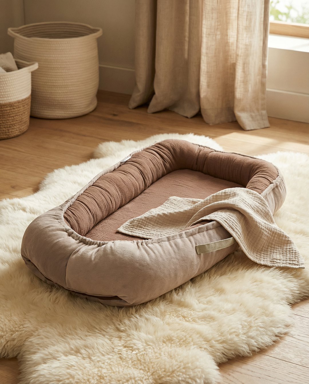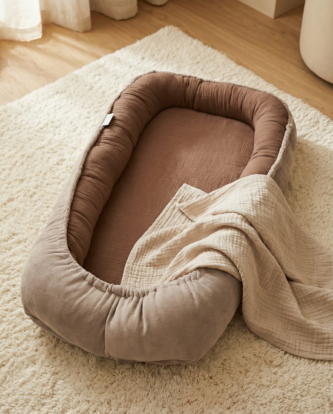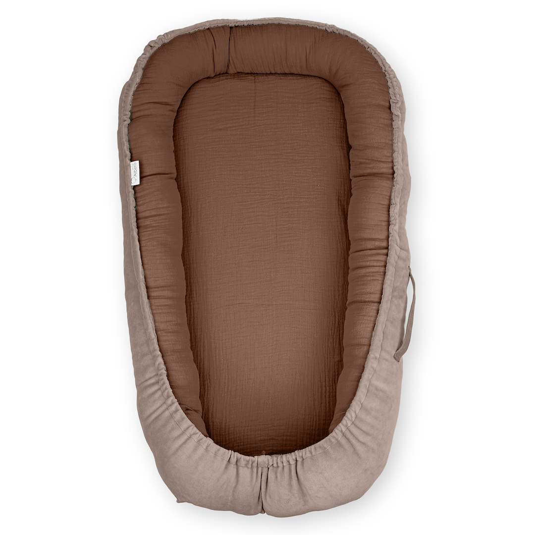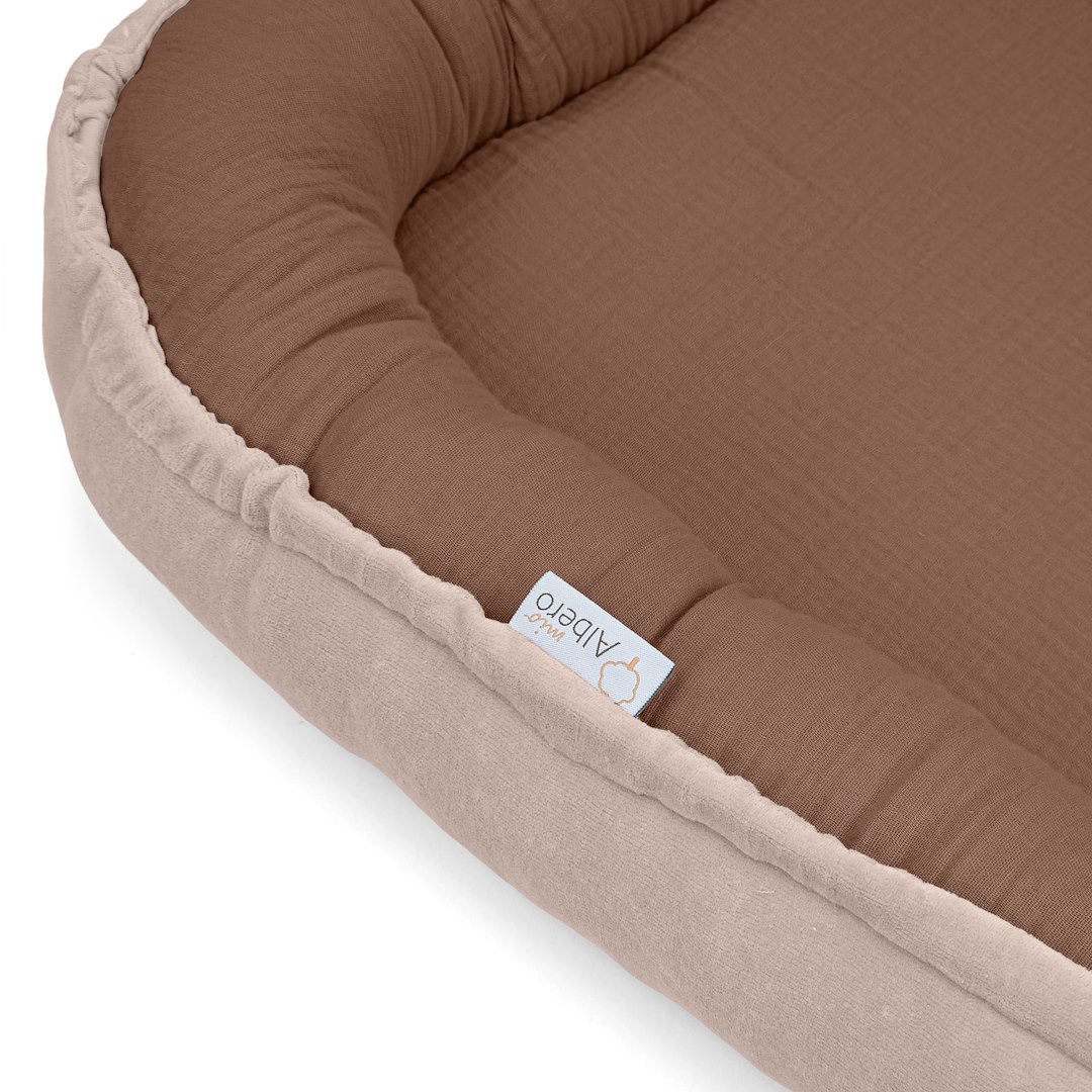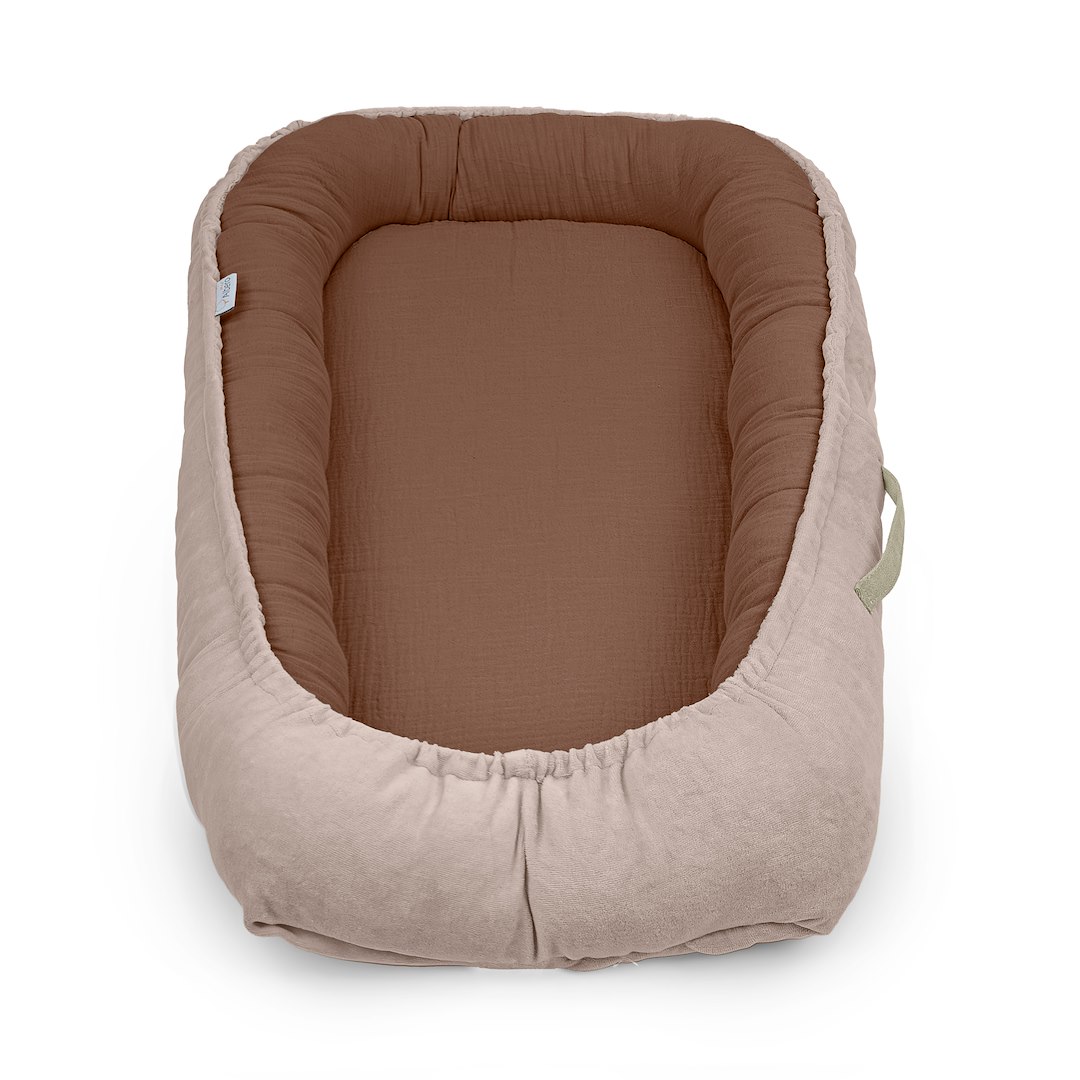Õrn seespool olev musliinkangas ümbritseb last ja pehme veluur välisküljel lisab hubasust. Kookoni täidis on hüpoallergeenne, mis minimeerib allergiate ja beebi nahaärrituste riski.