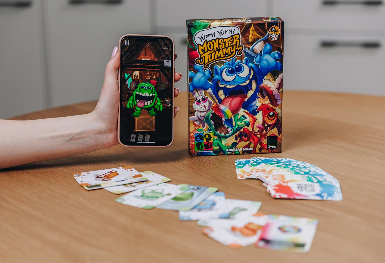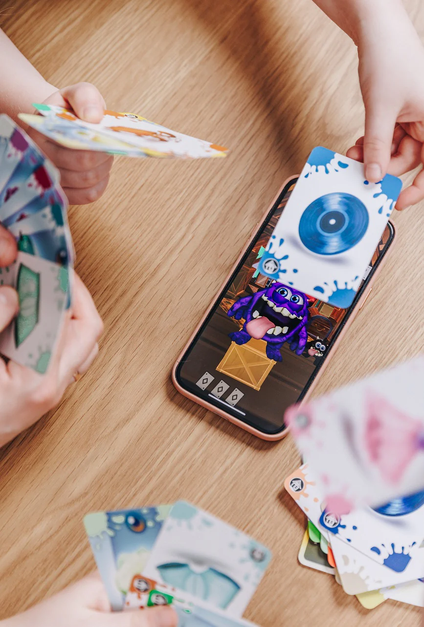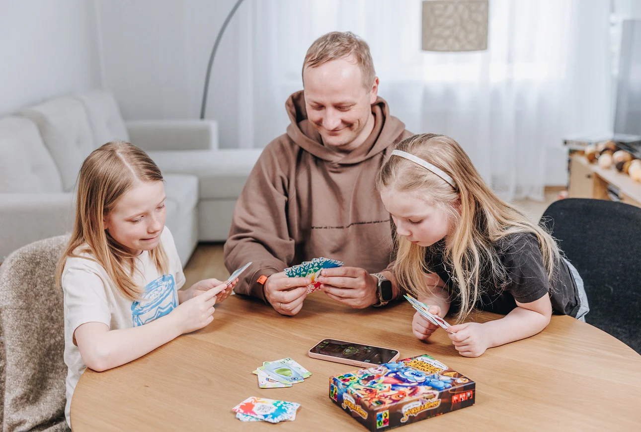 Peresõbralik, koostööl põhinev värvide sobitamise ja koletiste toitmise kaardimäng, kus vanemad lubavad oma lastel heameelega nutitelefone kasutada, kuna need on osa mängust.