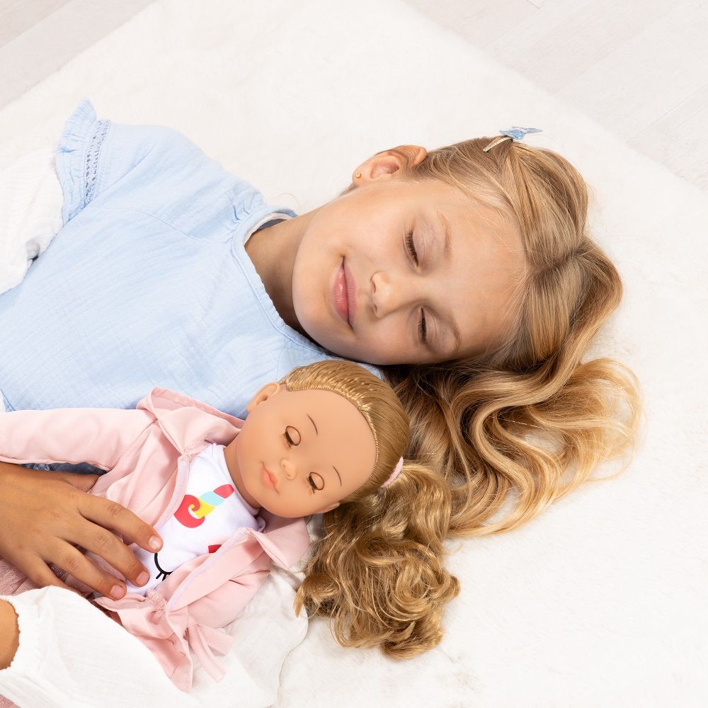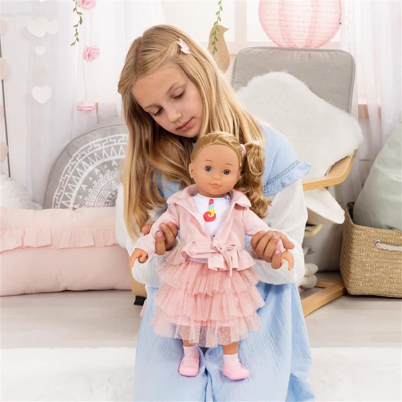 Pehme kehaga nukul on seljas kaunis kihiline seelik ja sobiv lühike jakike. Komplekti kuuluvad ka juukseaksessuaarid, millega laps saab harjutada kammimist, patsi punumist ja toredate soengute loomist – see arendab käelist osavust, loovust ning muudab ka päris kammimise kodus palju meeldivamaks.