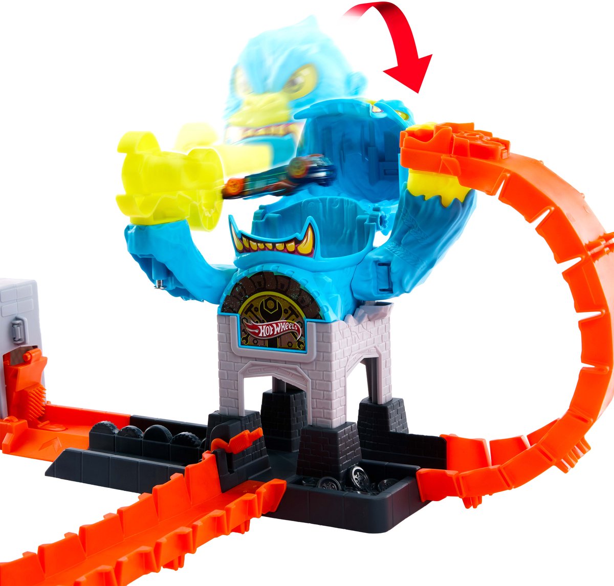 Gorilla eemaldamiseks ja Hot Wheels City taas turvaliseks muutmiseks vajutage mutrivõtmeplaati. Sellel on kiirklõpsuga rajaühendused hõlpsaks ehitamiseks ja komplektide laiendamiseks.