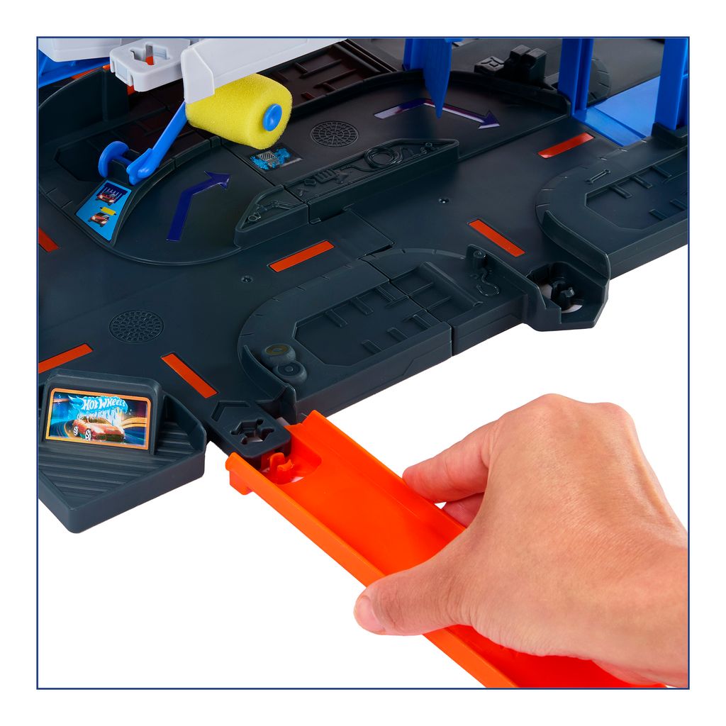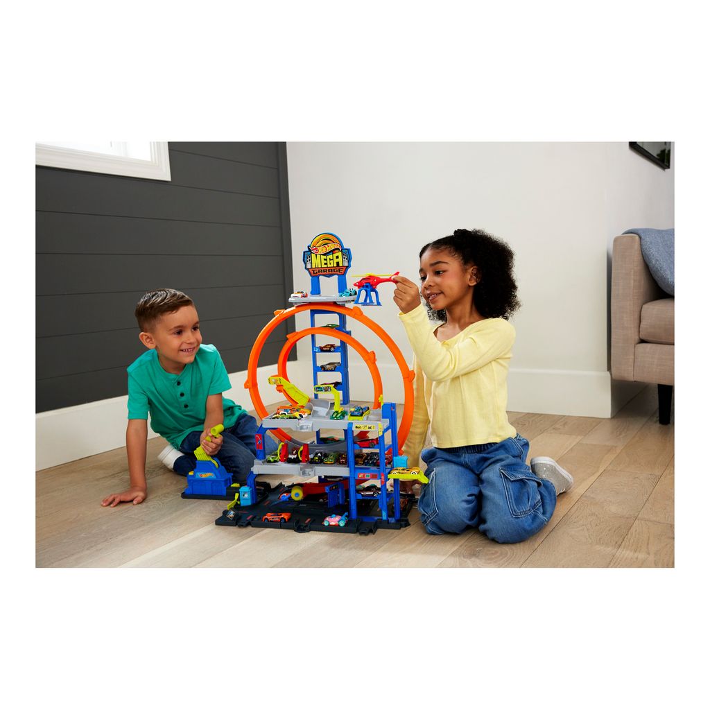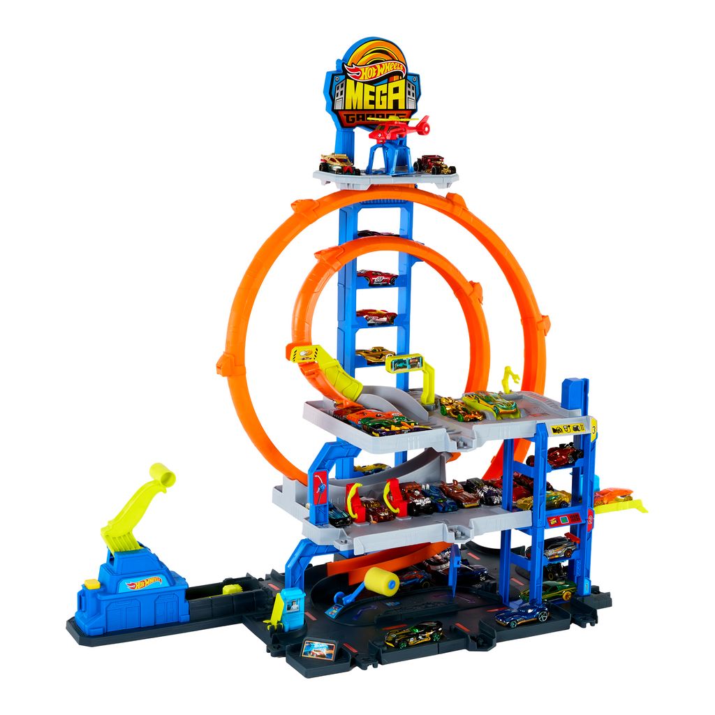 Hot Wheels Megagaraaži komplektis on kolm korrust tegevusrohket mängu ja põnevaid trikke! Alumisel korrusel ootab autopesula liikuvate vahtrullide ja kardinatega, millest saad auto saata äkk-stardist läbi topeltsilmusesse, kus pöördlülitid aitavad valida maandumiskorruse.