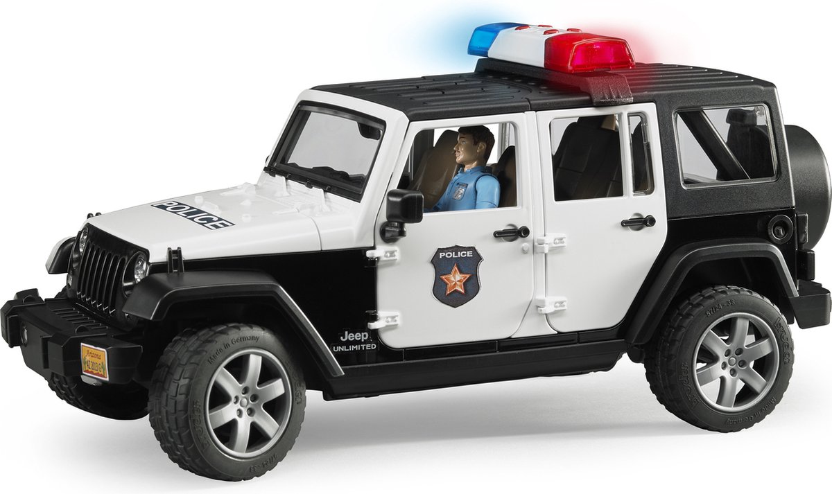 Taba pahalased Bruderi Jeep Police Wrangler Rubiconiga. See on Jeep Wrangleri politseiversioon, millel on päris valgus- ja heliefektid! Lisaks saab ka auto tagaosa ümber ehitada. Kogemuse täiustamiseks on komplektis politseiniku figuur.
