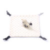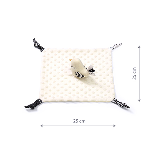 Funktsionaalne kaks-ühes toode: tekike ja kaisuloom. Aitab arendada lapse meeli esimestest elupäevadest alates. Pisikeste mummudega puuvillane materjal stimuleerib kompimismeelt, just nagu pehmed sõlmed või paelad, mis julgustavad last haaret harjutama. Kangas on hingav ja õrn.