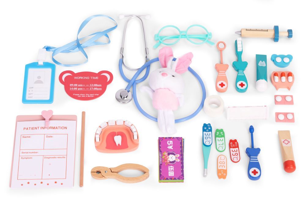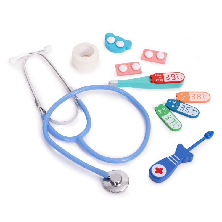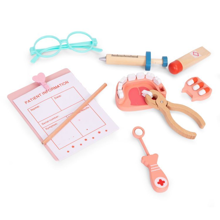 Komplekt sisaldab 28 realistlikku osa – sealhulgas stetoskoopi, süstalt, termomeetrit, prille, eemaldatavate hammastega proteesi, hambapeeglit, mänguravimeid, ID-kaarti, patsiendikaarti, töökalendrit, sidet, hambaharja ja mängurahatähti.
