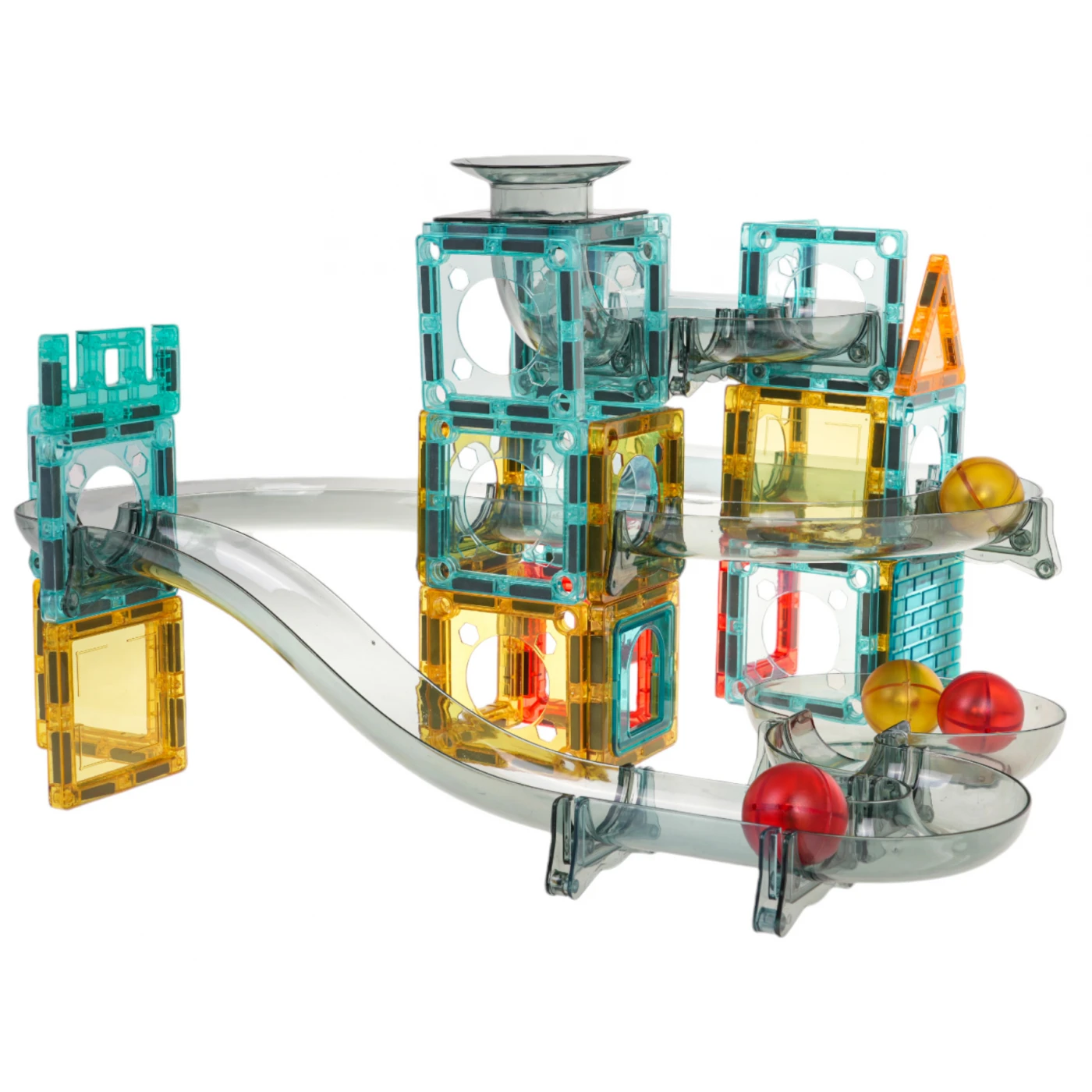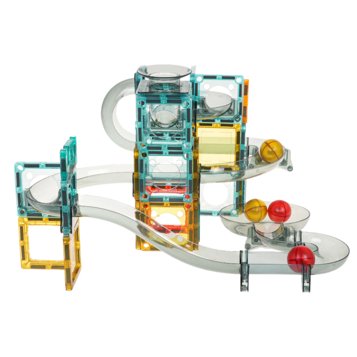 Värviline, vastupidav ja ise kokkupandav pallirada. Võite järgida komplektis olevaid pildilisi juhiseid või luua oma ehitise. Pallide laskmine ja nende looklevates tunnelites liikumise jälgimine on rõõmus, rahustav ja lõõgastav.