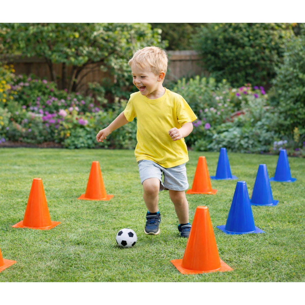 Treeningkoonuste komplekt palliga sobib ideaalselt aktiivseks mänguks nii õues kui ka siseruumides. Erksad oranžid ja sinised koonused ei jää märkamatuks.