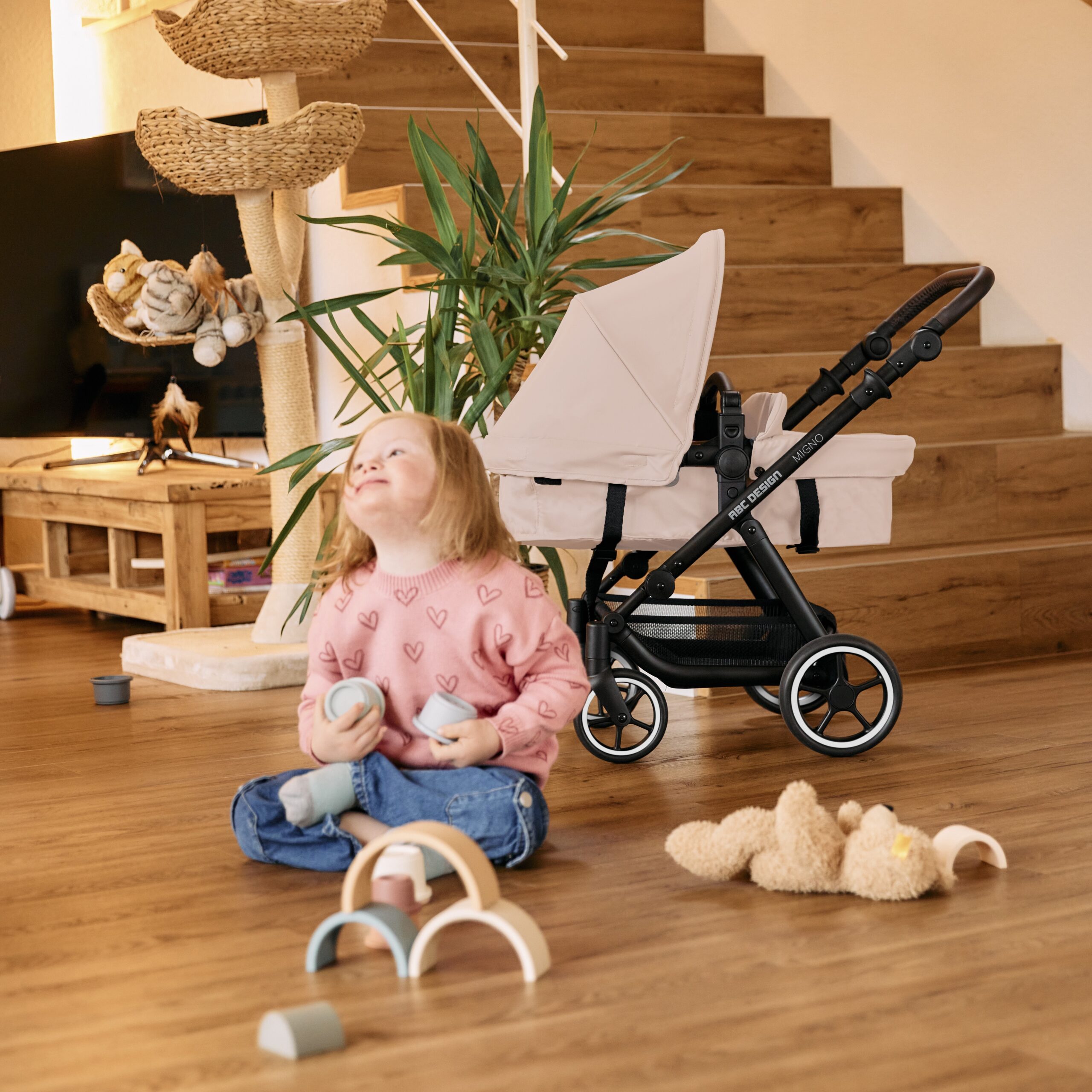 - Kaks-ühes funktsionaalsus – vankrikorvi saab lihtsasti eemaldada ja asendada istumisosaga, pakkudes lapsele mitmekülgsust ja rohkem mänguvõimalusi.