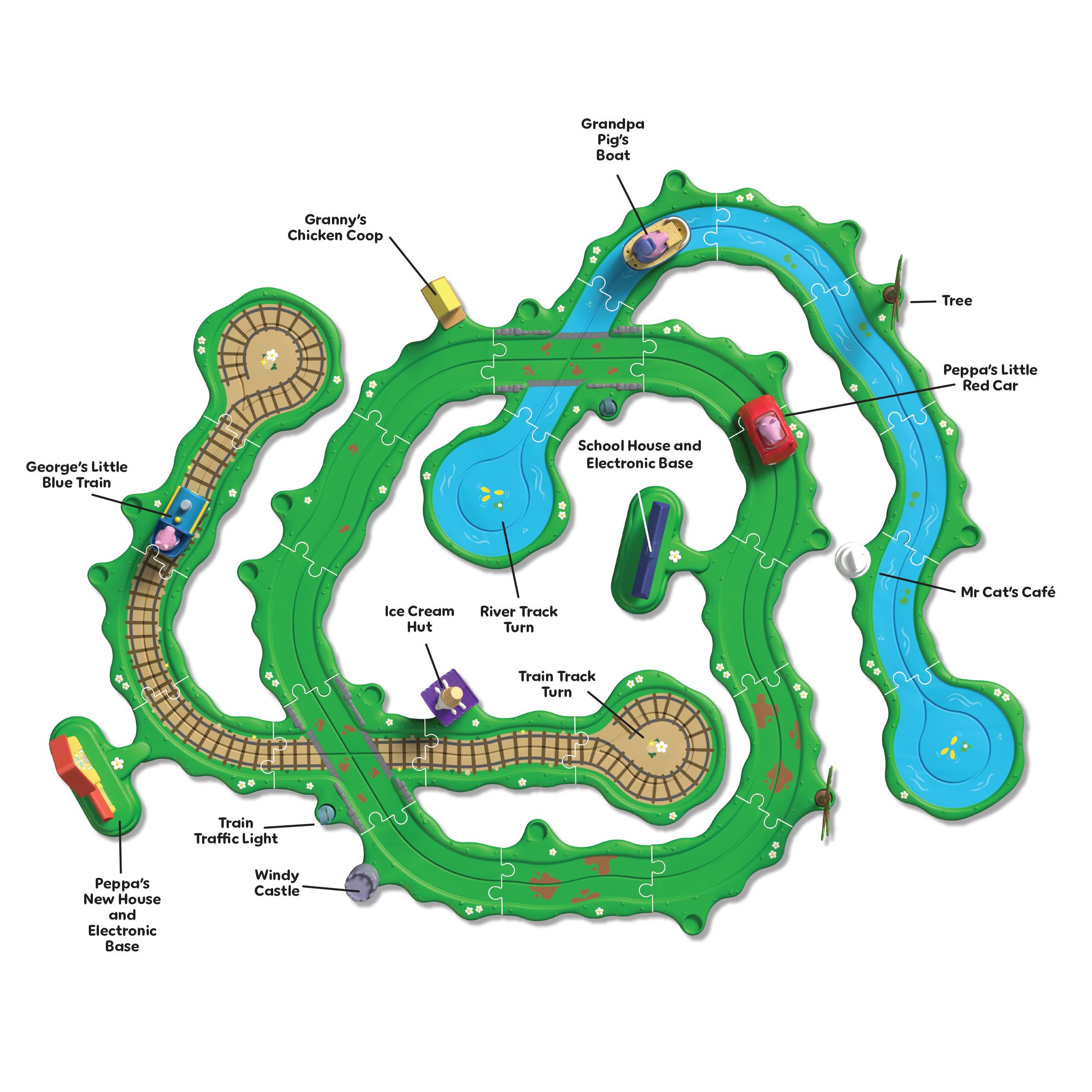 Komplekti kuuluvad: 10 rongirööpa osa, 2 rongitee kurvi, 10 teelõiku, 2 ülekäiku, 5 jõeosa, 2 jõe kurvi, 2 rongitee kurvi, 1 rongisõiduk, 1 autosõiduk, 1 paadisõiduk, 1 hr Kassi kohvik, 1 vanaema kanakuut, 1 jäätiseputka, 1 tuuline loss, 2 valgusfoori, 2 puud, 2 aeda, 1 maja, 1 koolimaja, 2 elektroonilist alust.