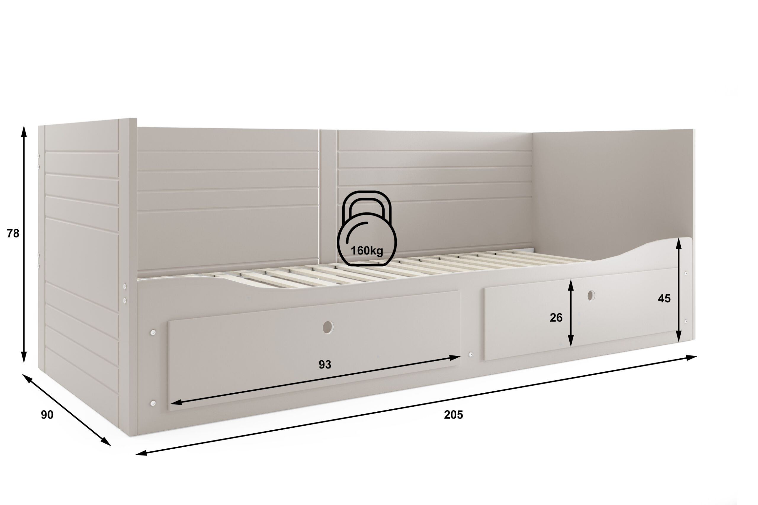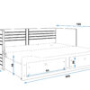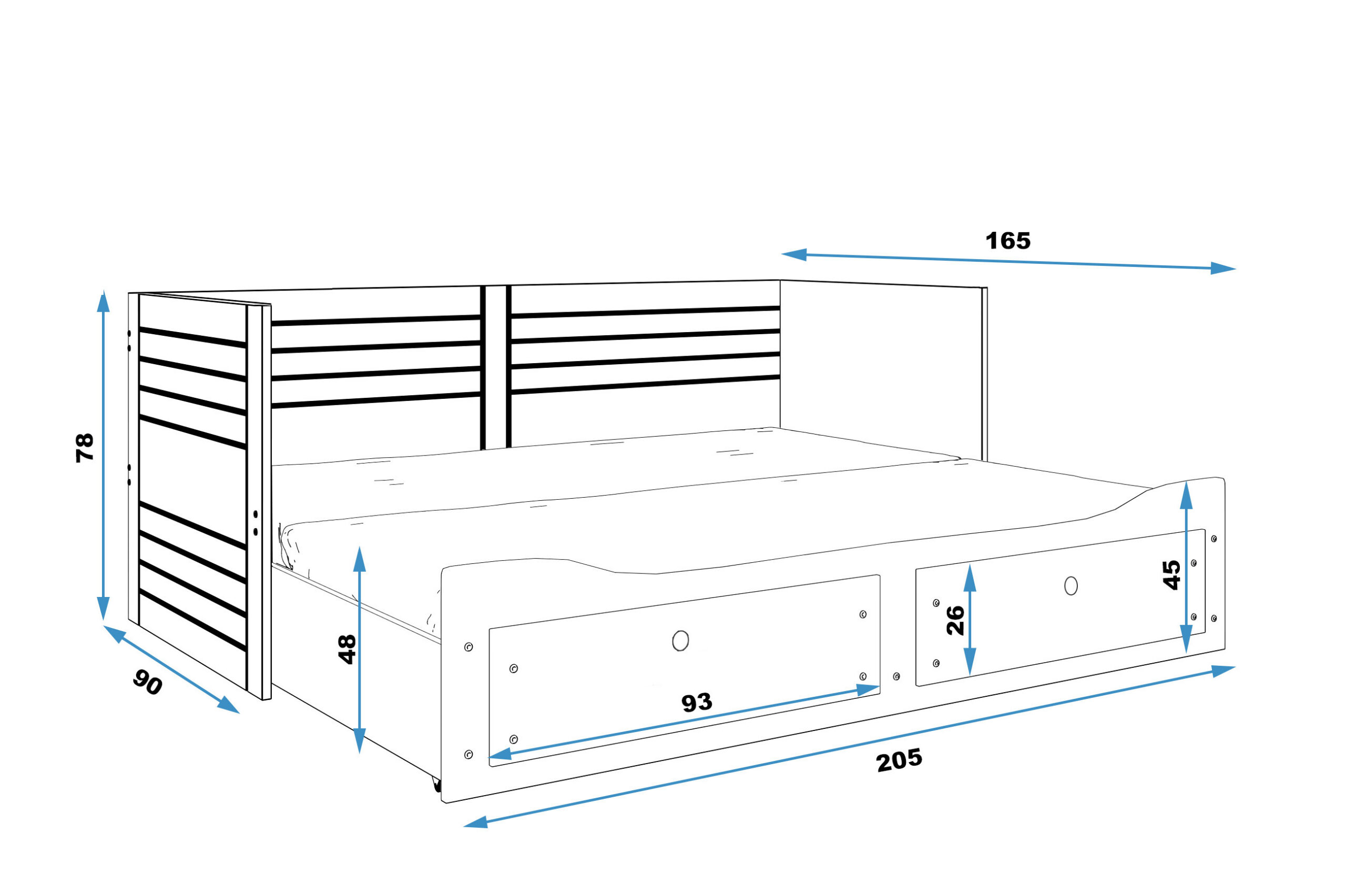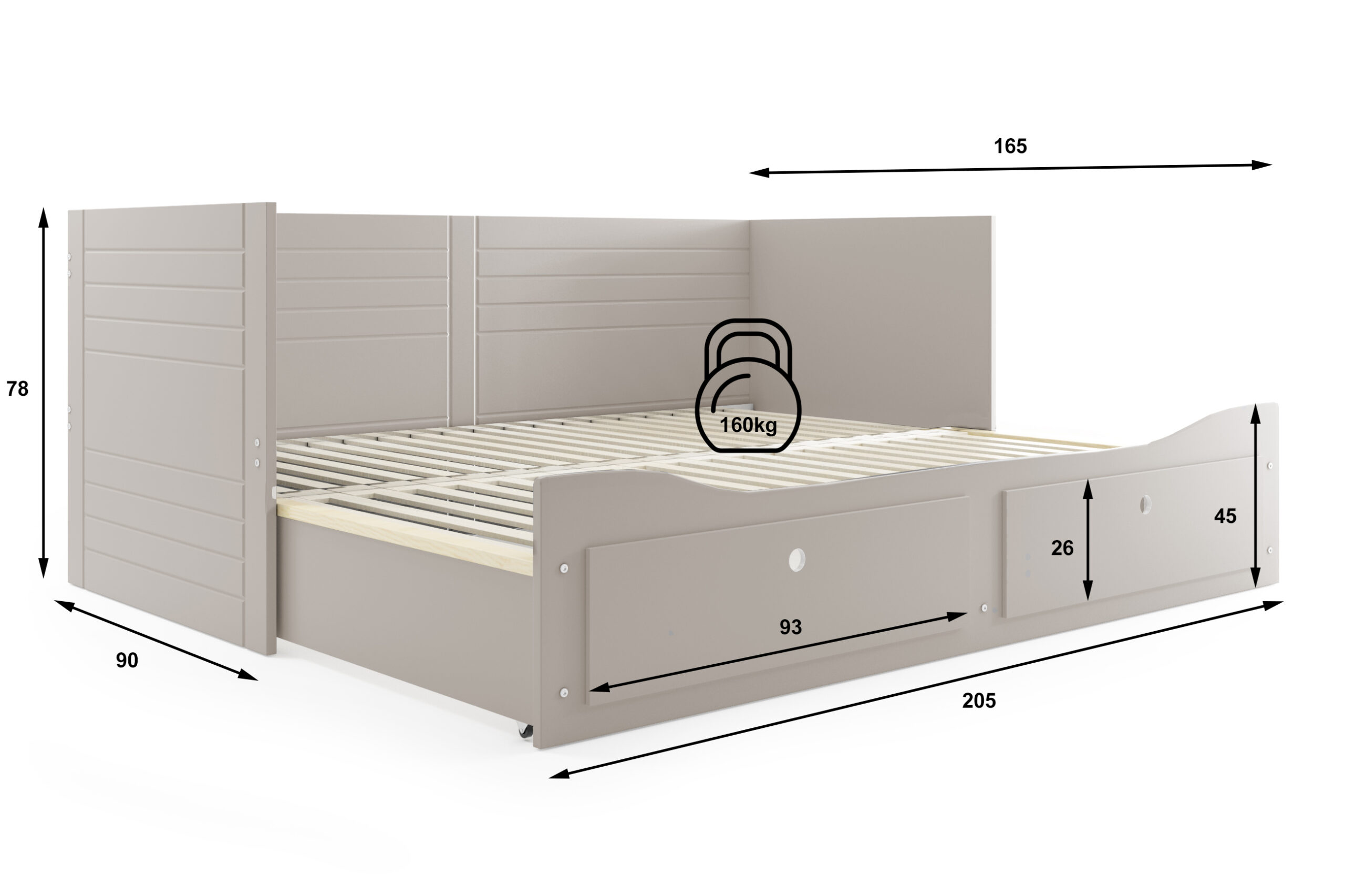 - Mõõdud: 78 cm (kõrgus) x 90-165 cm (laius) x 205 cm (pikkus)
