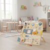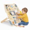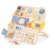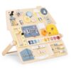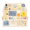 Puidust majakujuline tegevuslaud on stabiilne ja jalale toetuv mänguasi, mis on sisaldab mitmesuguseid hariduslikke elemente, nagu värvilised numbrid, arvelaud, kell, hammasrattad, paeltega king, kraan, pandlaga vöö ja kruvidega hoiuruum.