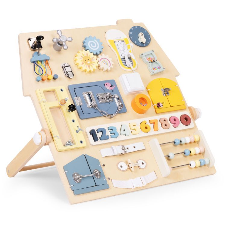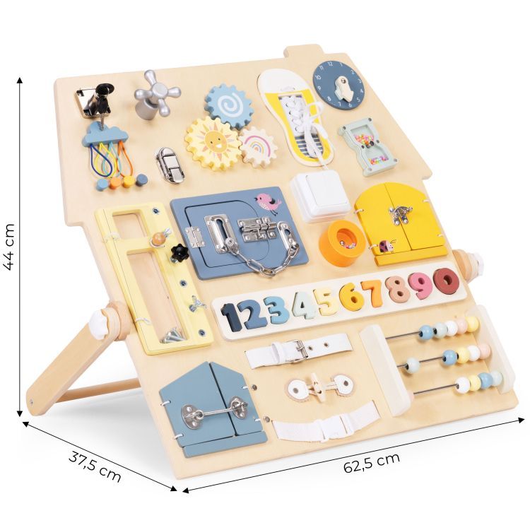 Puidust majakujuline tegevuslaud on stabiilne ja jalale toetuv mänguasi, mis on sisaldab mitmesuguseid hariduslikke elemente, nagu värvilised numbrid, arvelaud, kell, hammasrattad, paeltega king, kraan, pandlaga vöö ja kruvidega hoiuruum.