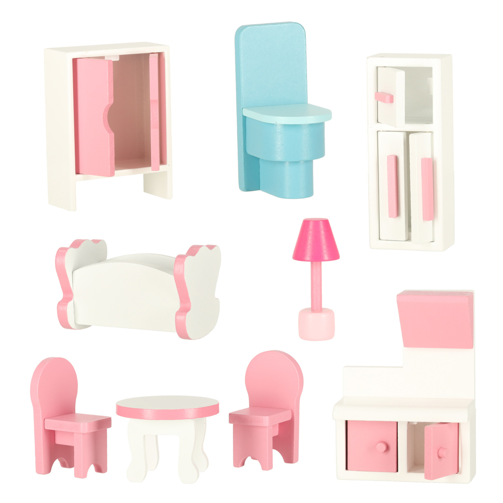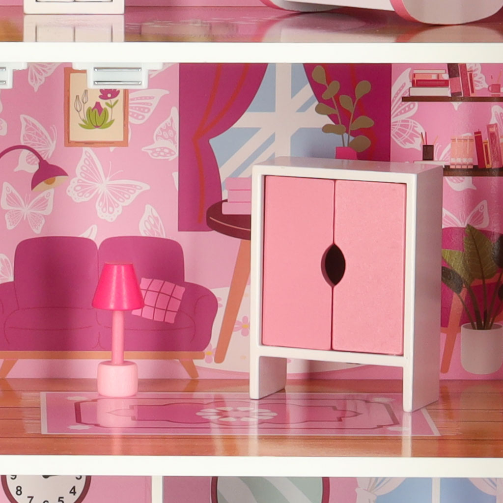 Võluv nukumaja lukustatava uksega on kahtlemata lapse toa ilus dekoratiivne lisa. Uksed ja sahtel muudavad asjade korrashoidmise pärast mänguaega lihtsaks. Sellel on miniatuurne mööbel – stiilne mööblikomplekt võimaldab sisekujundust just nii korraldada, nagu soovite. Uksed sulguvad magnetiga.