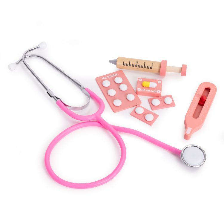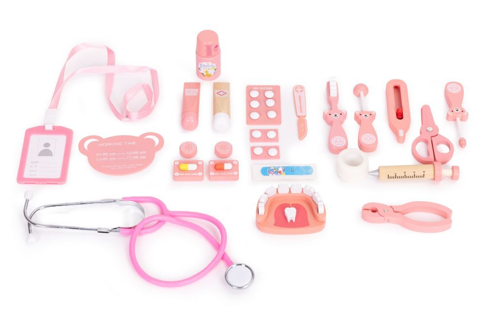 Roosa arstikohver + puidust tarvikud, 24-osaline