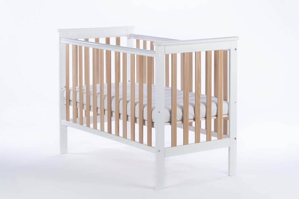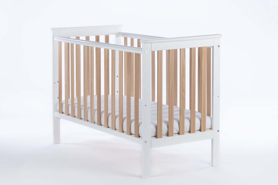Võrevoodi “Fox”, allalastava küljega, valge-puit